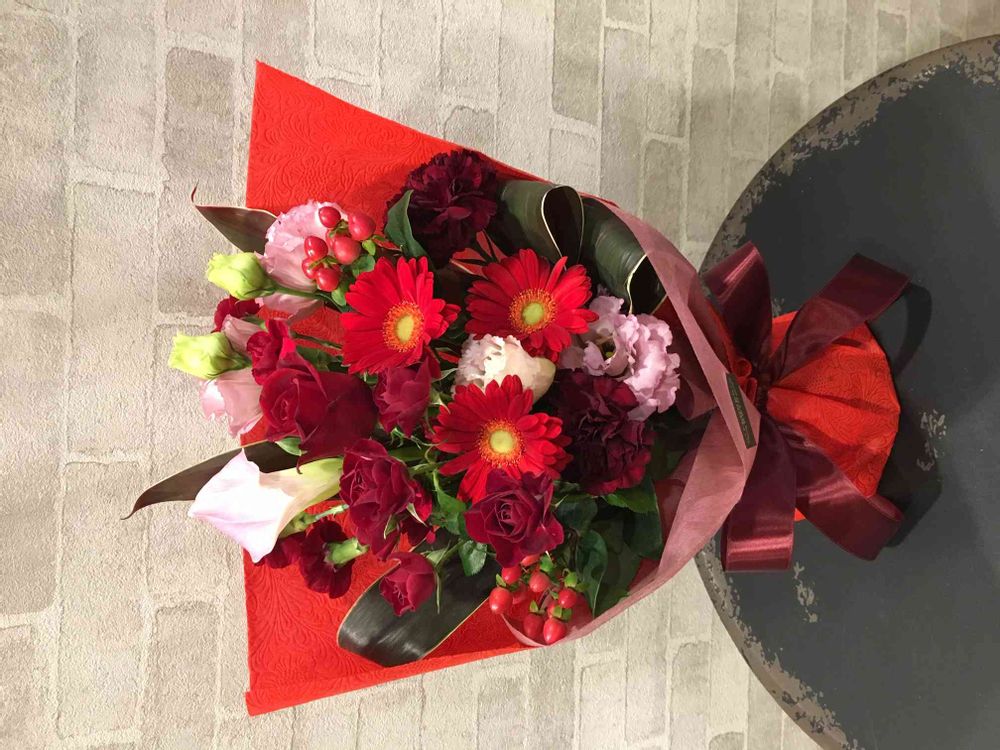 フラワーショップ京王府中店で人気の自立する花束のご紹介です。フラワーベースが無くてもそのまま飾れます。高さもあるので、ボリューム満点☆この時期はクリスマスカラーでお作りする事も♪一年の締めくくりに大切な方へのギフトにいかがでしょうか?