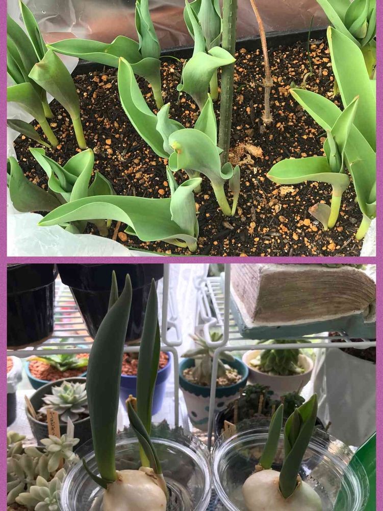 上📷成長の遅かったプランター植えが、下📷水耕栽培の子を追い越して、チューリップらしい葉姿になってきました😁