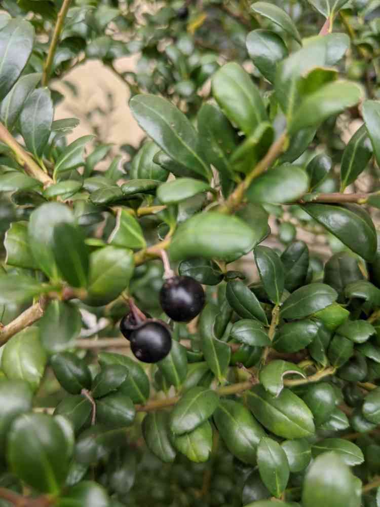 25年目にして始めて実が付いた我が家の庭木。花は白い小さなのが咲いて、お隣さんとの丁度目隠しにしている(男性陣が剪定して目隠しには、なっていないが)。