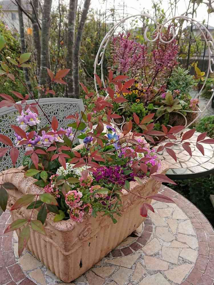 手前の四角の素焼き鉢には南天とヒメフウロソウ、バーベナメイテンが植えてありました♬.*゚