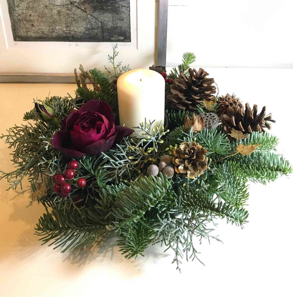 急いでクリスマスアレンジで使ったあまりのモミの木、剪定したブルーアイス、拾い集めてあった木の実でテーブルアレンジを作った。長く咲いているといいけれど…