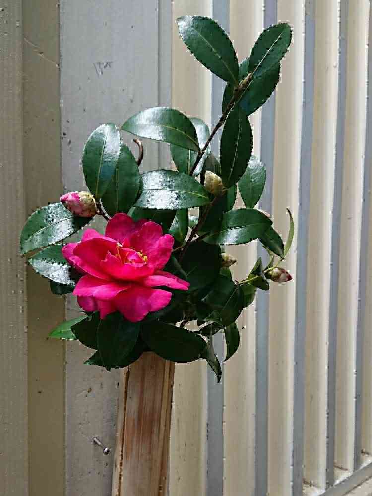 山の無人駅の待合室に生けられた椿一輪🌼🌱