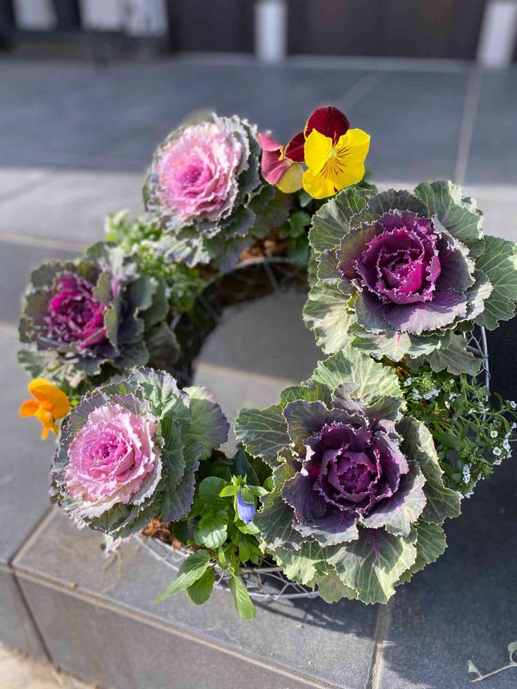 蝶々🦋に見えて、葉牡丹が華やかでとっても素敵なリースです👍