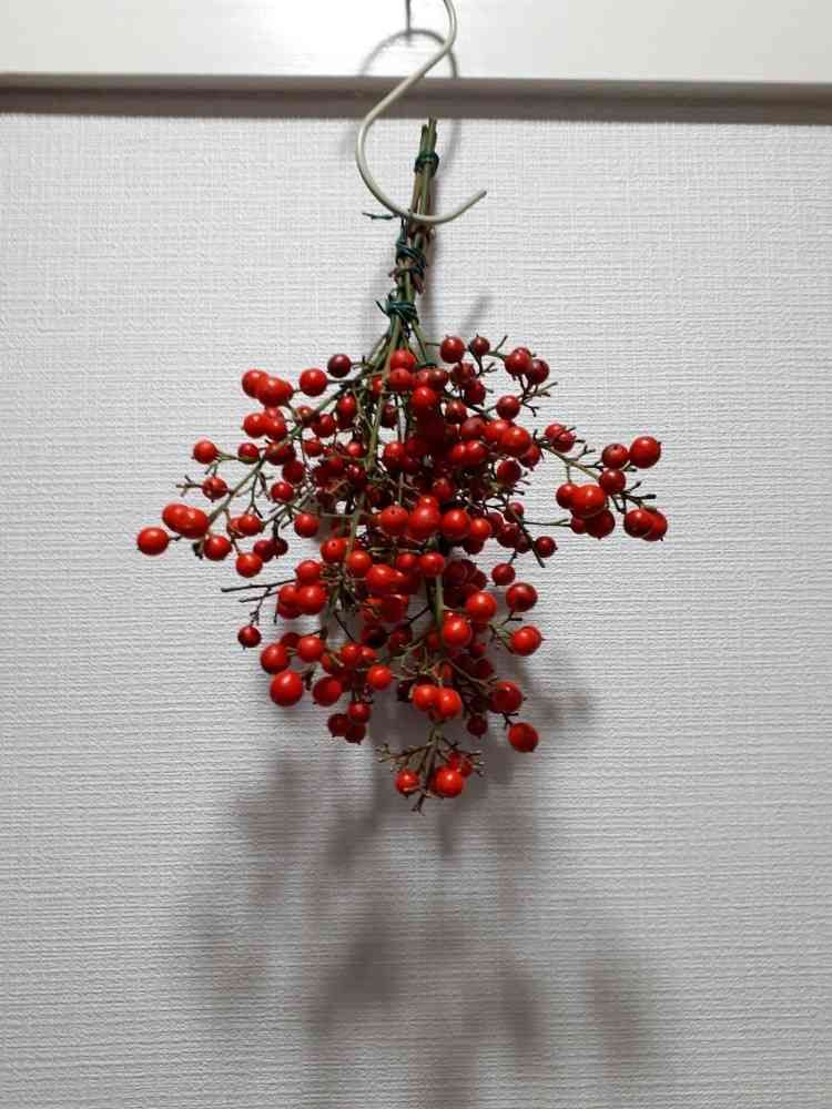 リースにする場合、わっかになったリースをかって、そこへ南天の実を針金みたいなもので止めていき、緑の葉っぱみたいなもので、埋めていくときれいにできますよ🎵
