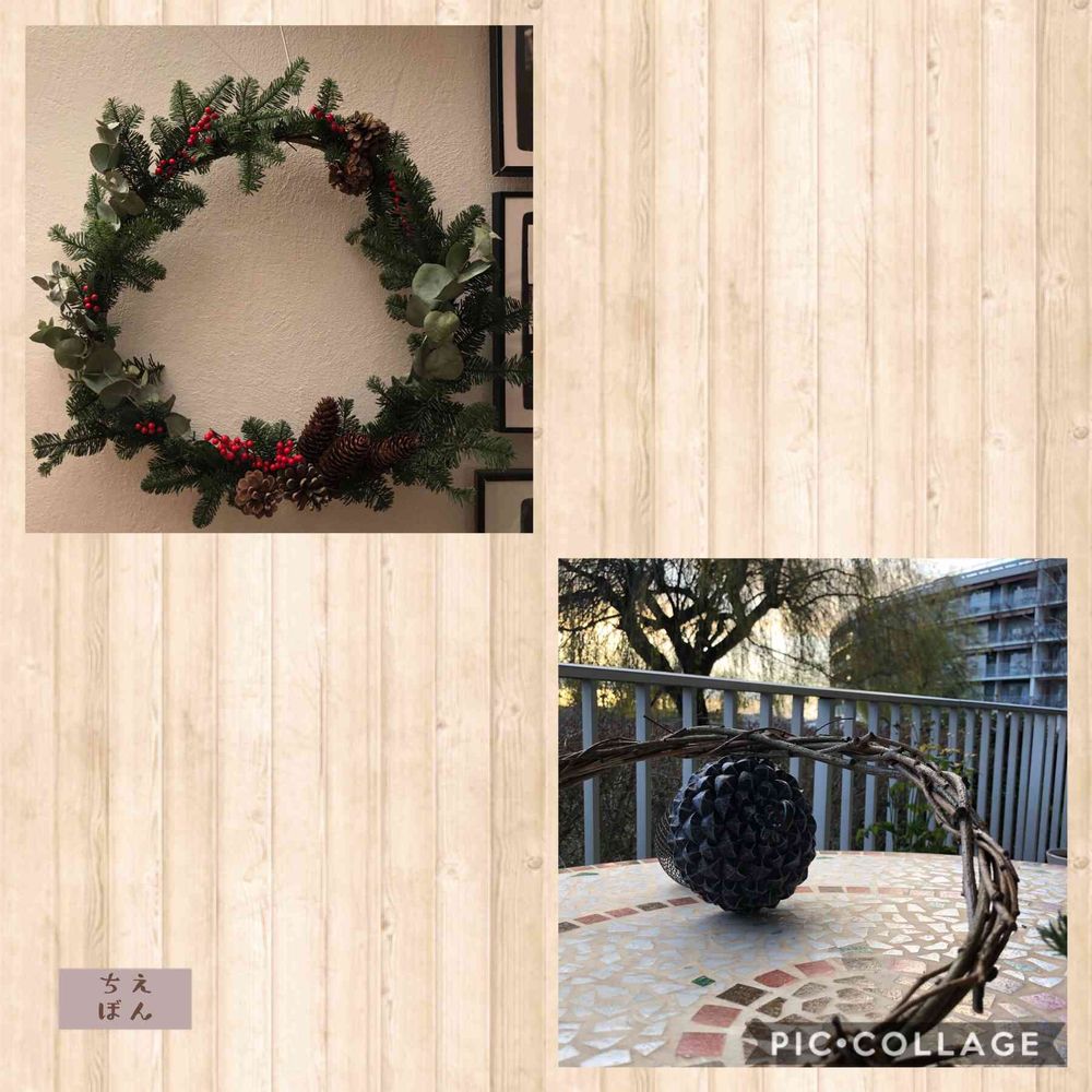 落ちてた庭の柳の枝を編み、クリスマスリースを作ってみました✨