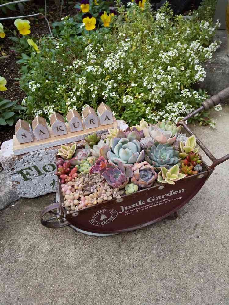 優しい色合いのかわいい多肉さんを詰め込んだ一輪車のカート♡素敵だね✨
