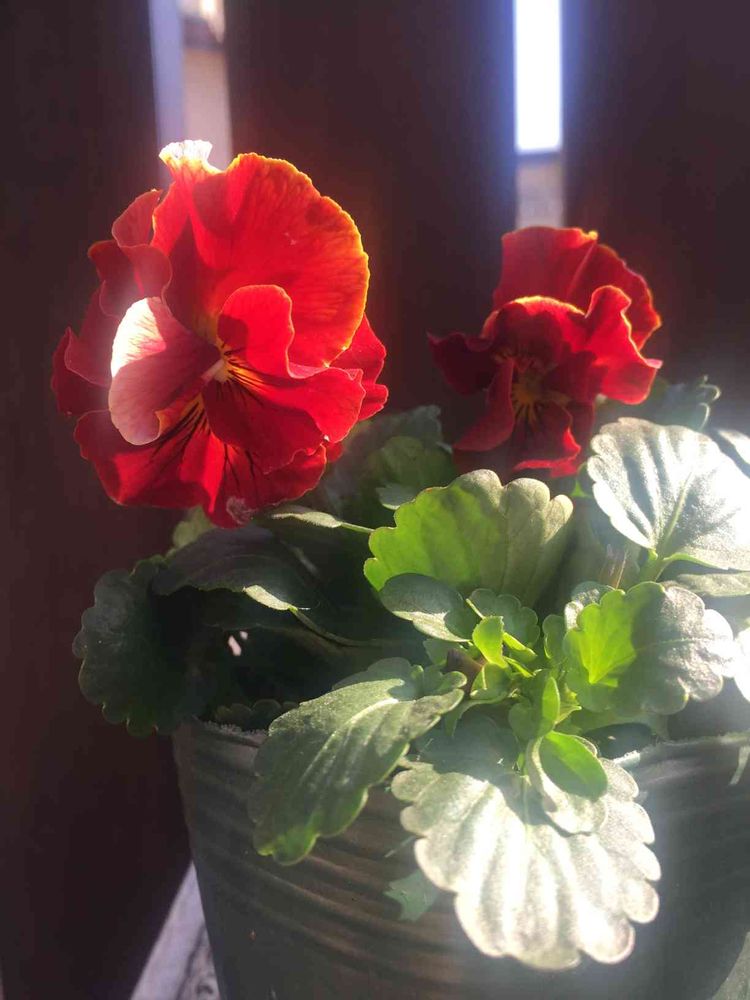 陽射しを浴びて赤いパンジーさん輝いていますね✨