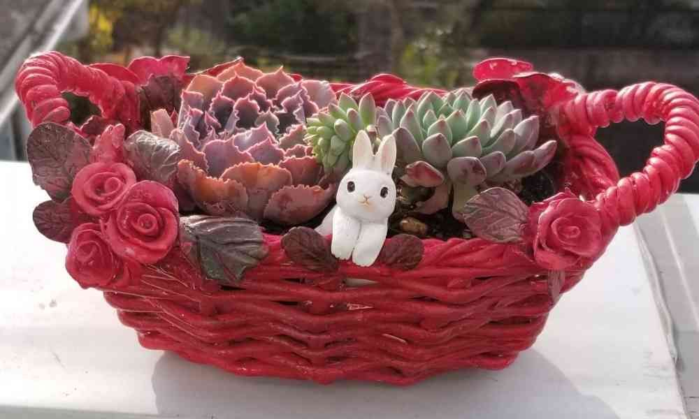赤いカゴに紅葉した多肉ちゃんの寄せ植え