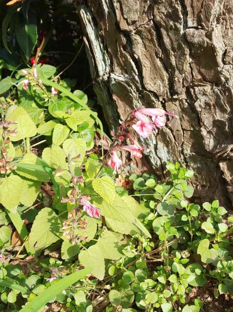 松の木下で、霜が当たらないから、まだ、咲いてる😊