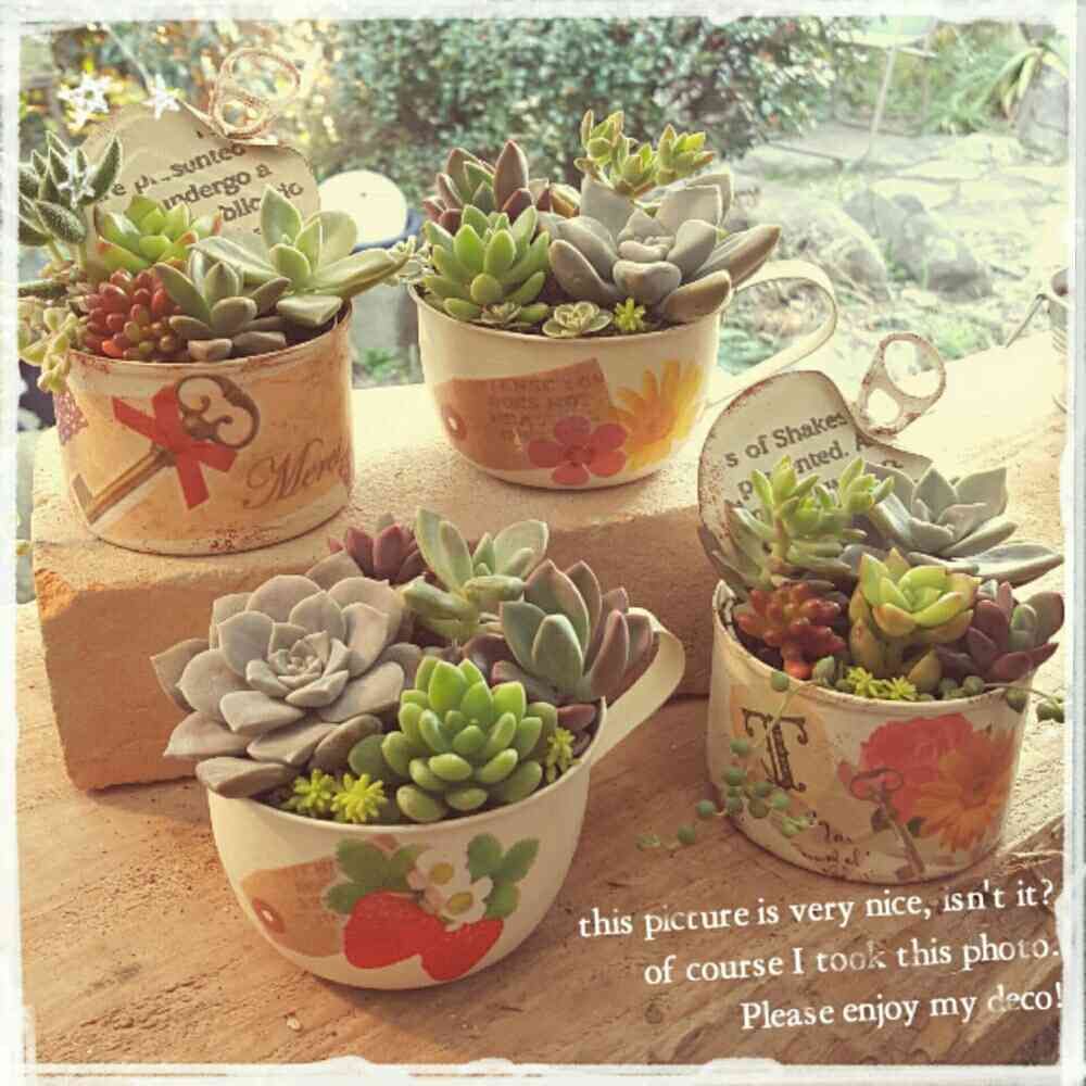 手づくりリメ缶素敵ですね❤多肉ちゃんもかわいく寄せてありますね❤