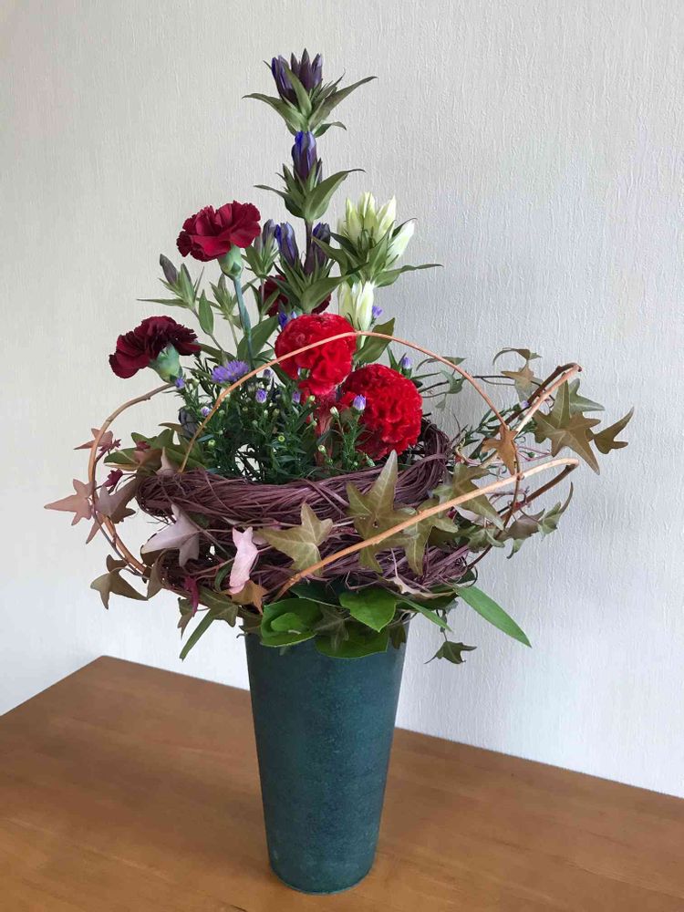 これは去年の秋のレッスンで作ったものです。ラタンコードとパンリードを使って巻かれた感じのベースを作ってからお花を挿していきました。