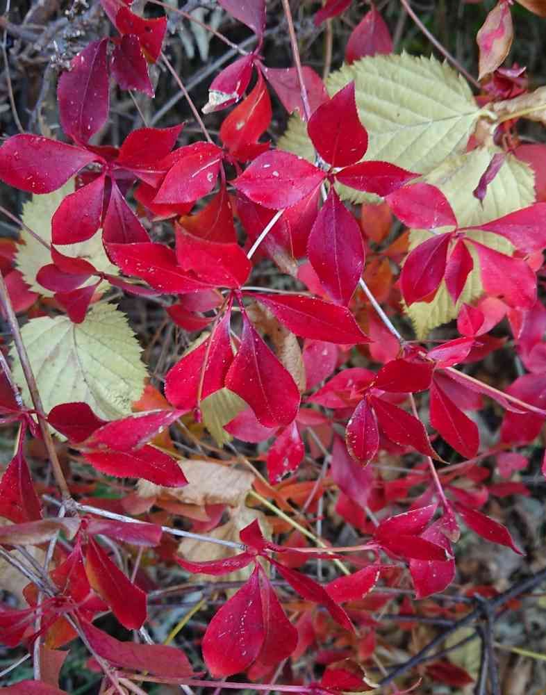 鮮やかなドウダンツツジと色褪せたヤマブキの葉っぱのアンサンブル✨