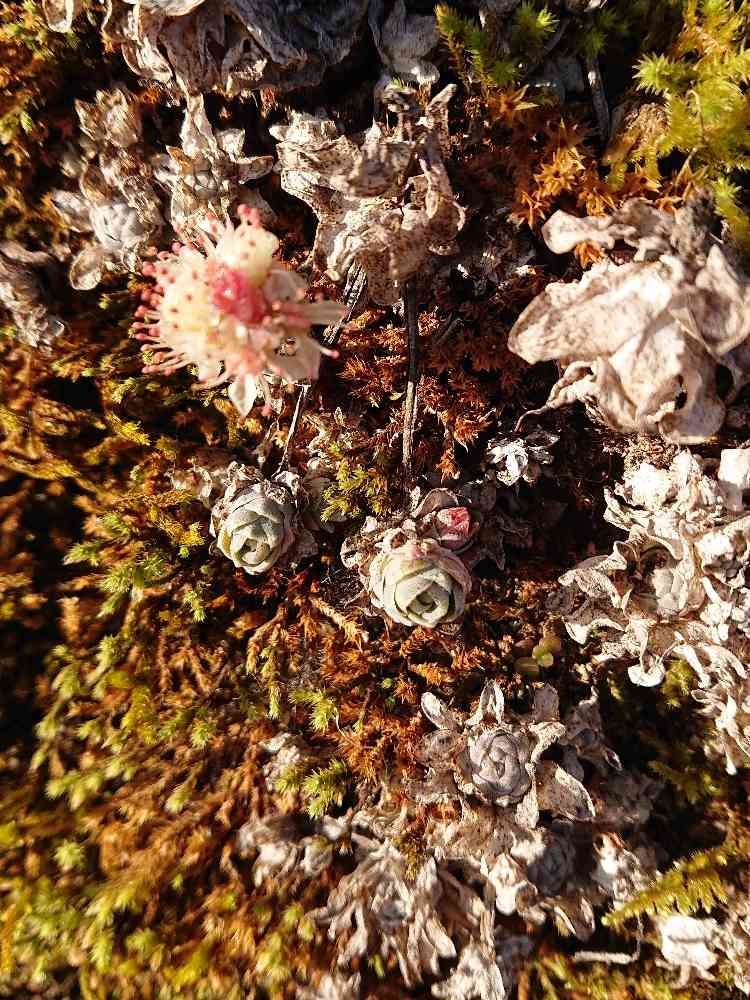 寒い朝、石垣にへばりついて、縮こまって春を待つ子持ち蓮華🌵
