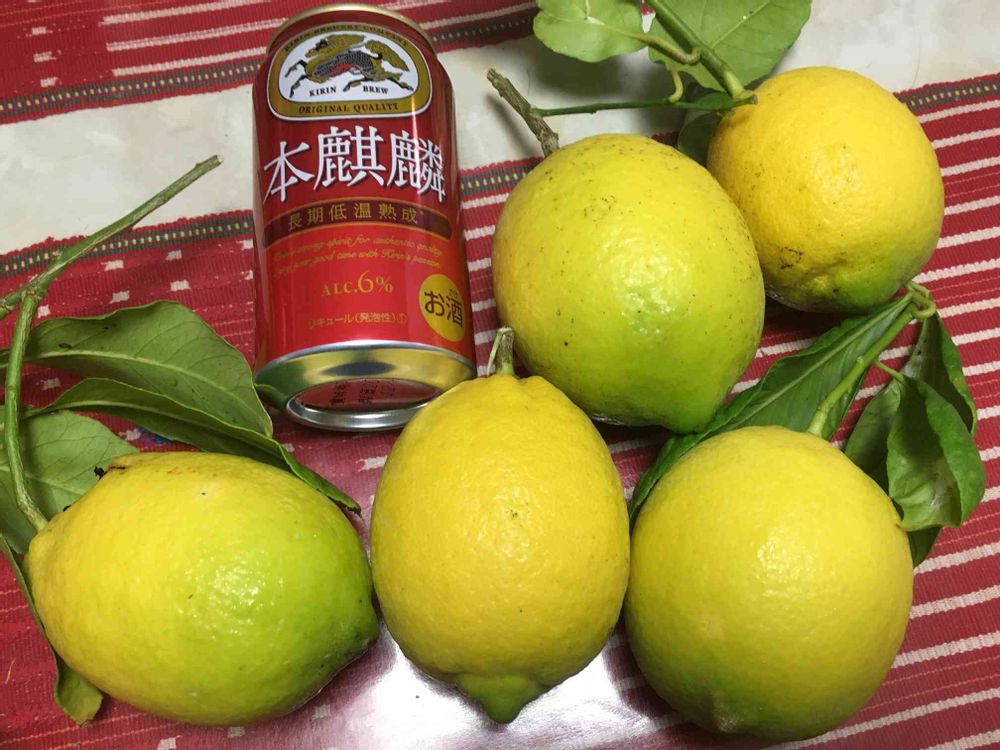 スーパーで見かけるレモンよりずっと大きい。大きさ比較のために500ml缶を並べて撮影しちゃいました。