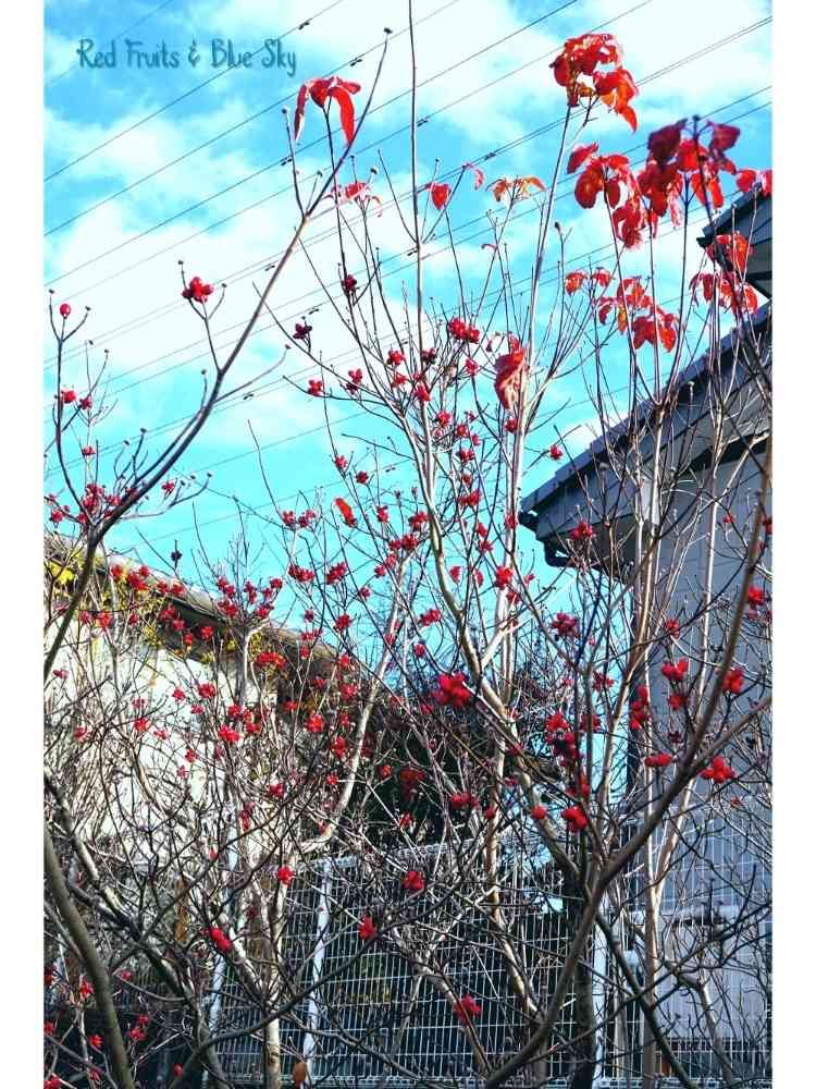 ちんちん電車遊歩道のハナミズキ。落葉がほぼ終わり、赤い実が青空に映える。🍒🚶