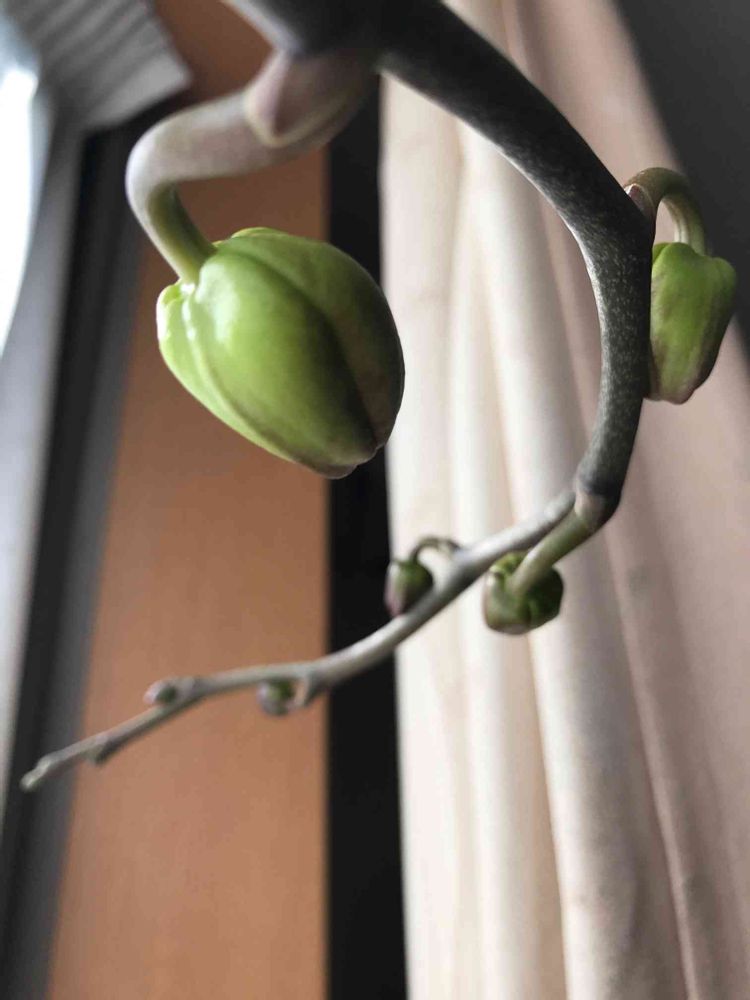 家で一番場所を取っている大輪系の胡蝶蘭。子株から出た花芽がだいぶ成長してきた😁