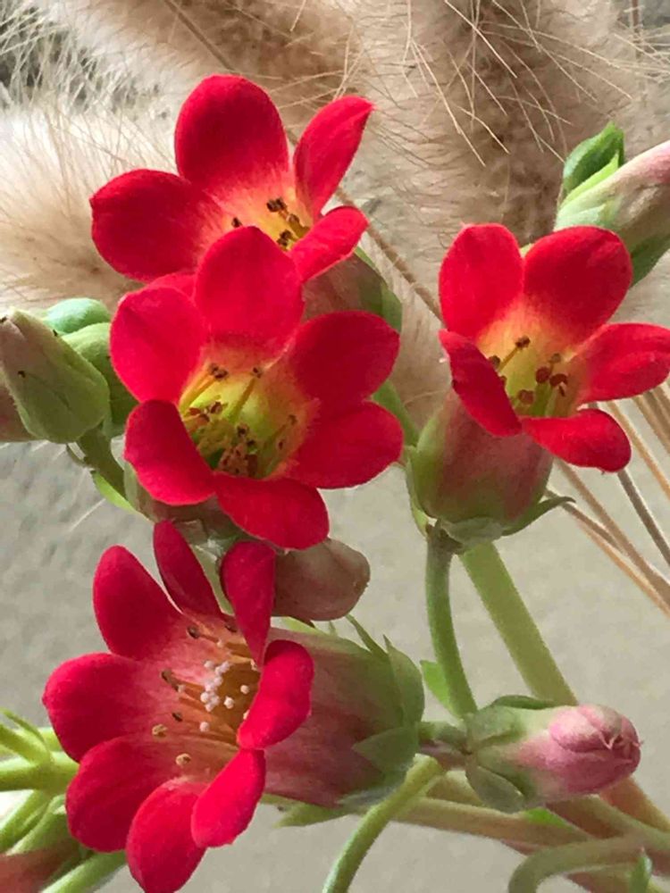何年も前に職場に持って来たカランコエが、ヒョロヒョロですが咲きました❣️