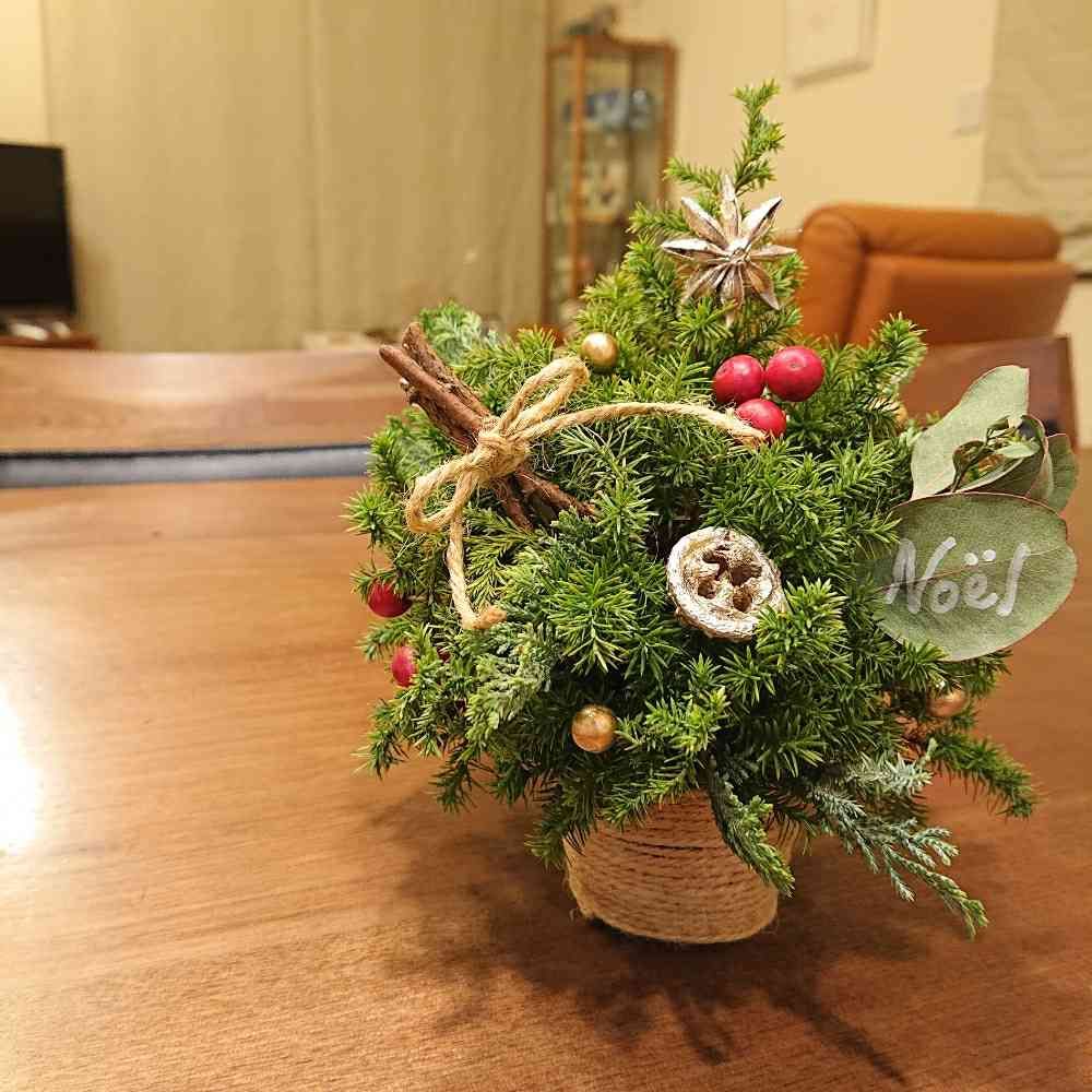 リースの残りのスギと庭のコニファーでミニミニツリー🎄