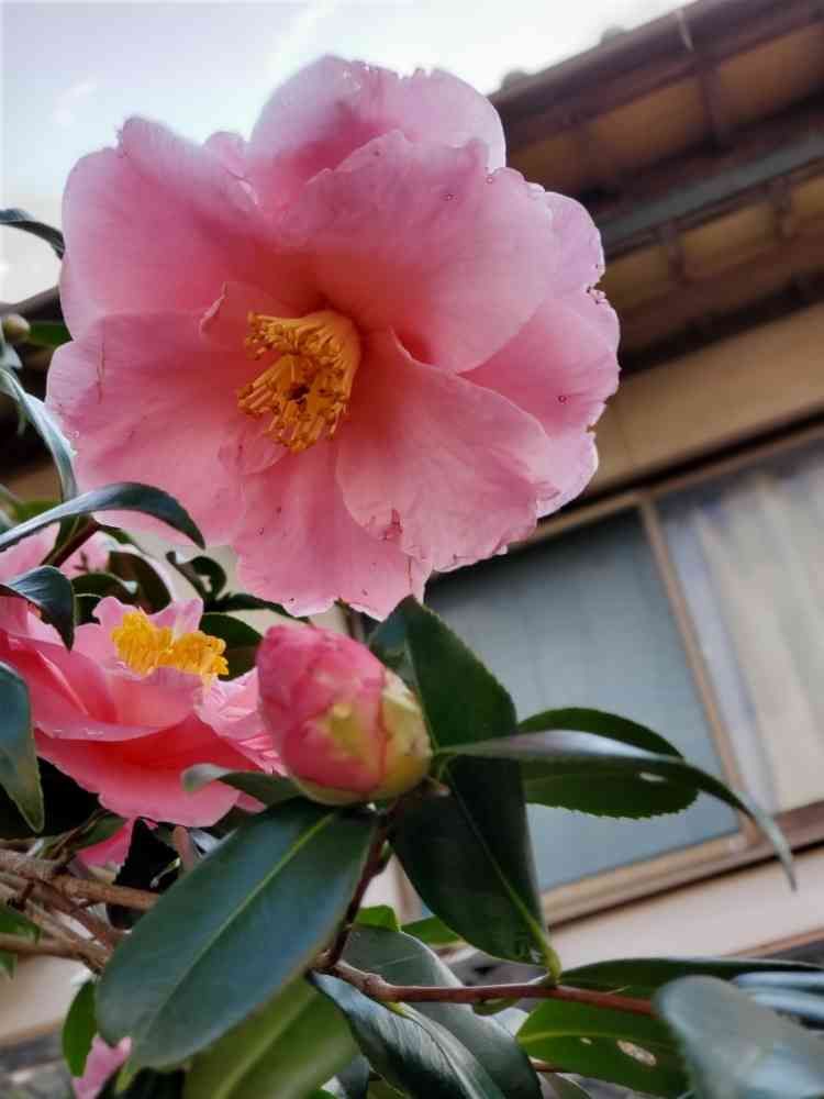 ほほえみ 素敵名前貰ったのね❗ サザンカとつばきの掛け合わせ! 今満開➰🍀 優しいピンク