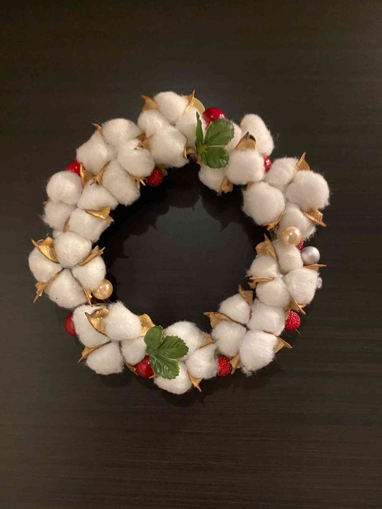 綿の実でクリスマスリースを作りました。あまりゴージャスな飾りは好きではなく、こんな感じのシンプルなものが好みです。