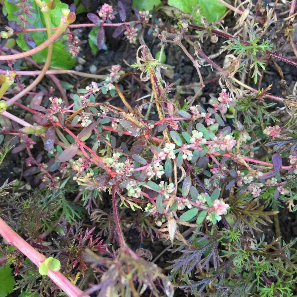 以前、雑草として生えていたのを人為的に移植したものの定着しなかったハイニシキソウ。センテッドゼラニウムとバーベナの間で自然に生えているのを発見。低く匍匐して地面をカバーしてくれるなら歓迎するよ。
