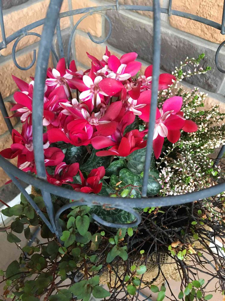 シクラメンジックスです。上から見ると可愛いです。カゴの中にカルーナやワイヤープランツと寄せ鉢にしています。