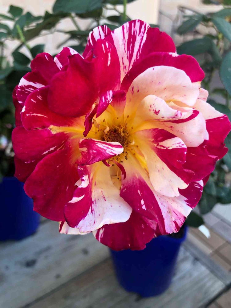 真紅に黄色と白の絞りの鮮やかなコントラストでフリル状の花びら。