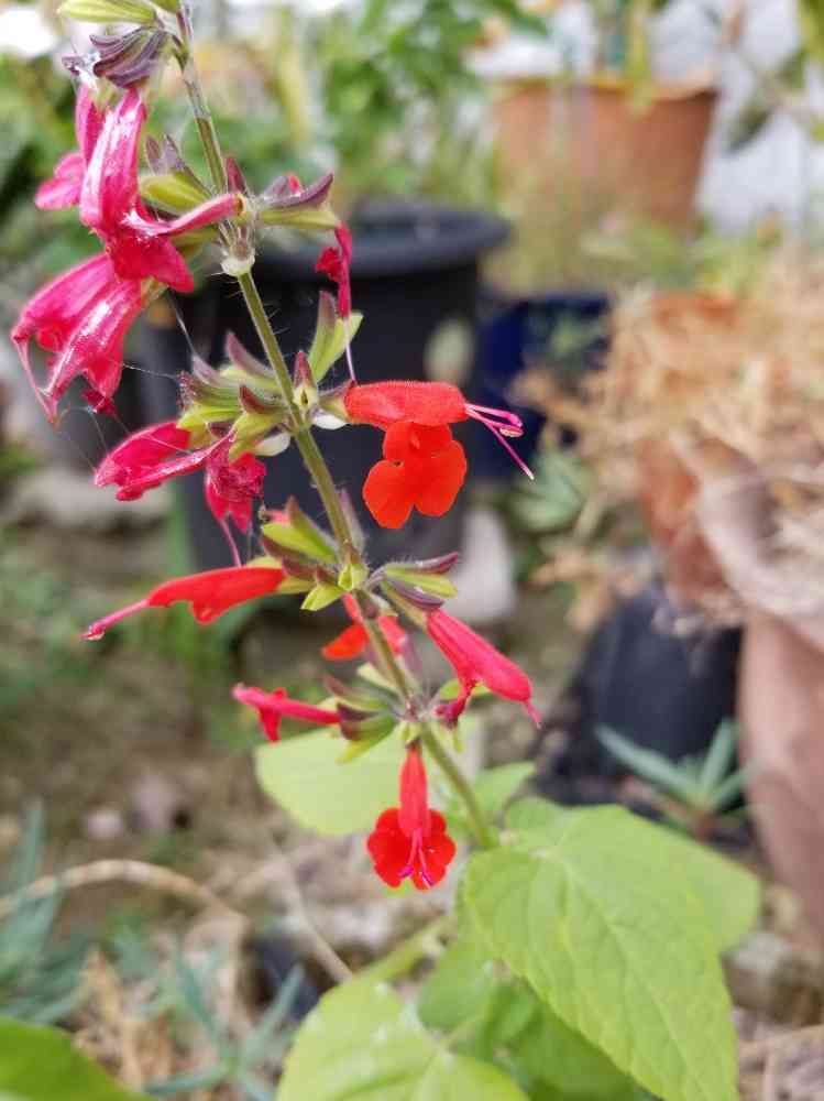 この時期は同じサルビアの仲間でホットリップス(サルビア・ミクロフィラの品種改良)も咲いています。赤い模様が唇のように見える花です。探してみてくださいね!