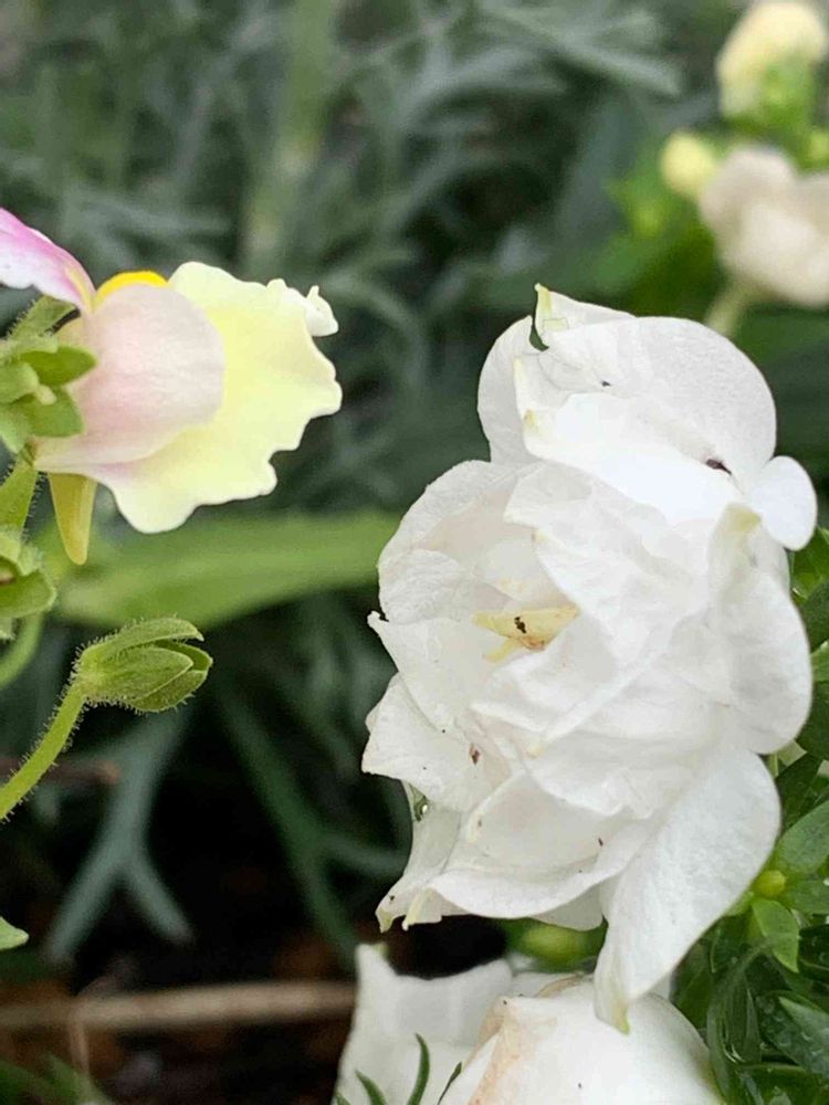 八重咲きさん、ほんとに小さなバラさんみたいだね〜💚ネメシアさんの優しい色とよく似合う💛🌸お話ししてるのかな😊💖