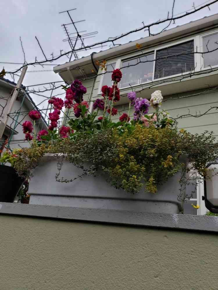 ストックを剪定し、寄せ植えのためのグリーンプランツも枯れているところを剪定して整えました。