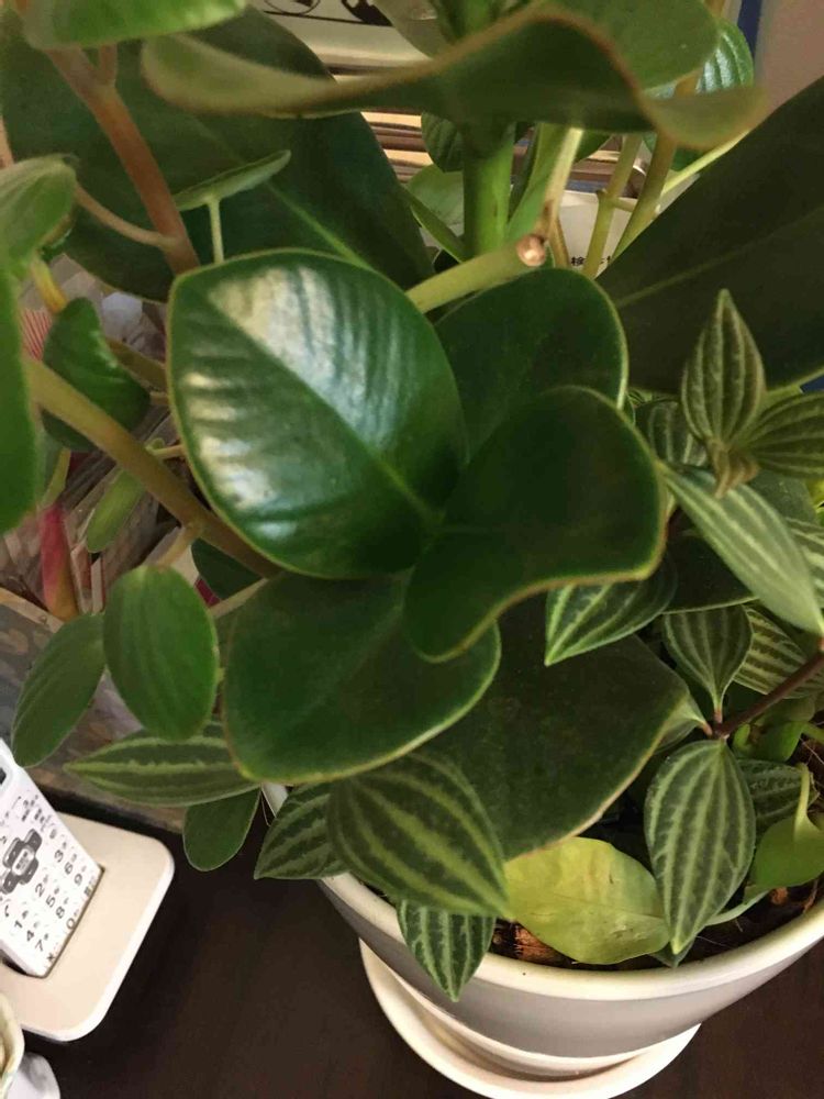 よく気付きましたね。この鉢にはペペロミアが3種類入っています。しかし中央のペペロミアだけは詳しい名前がわかりません。