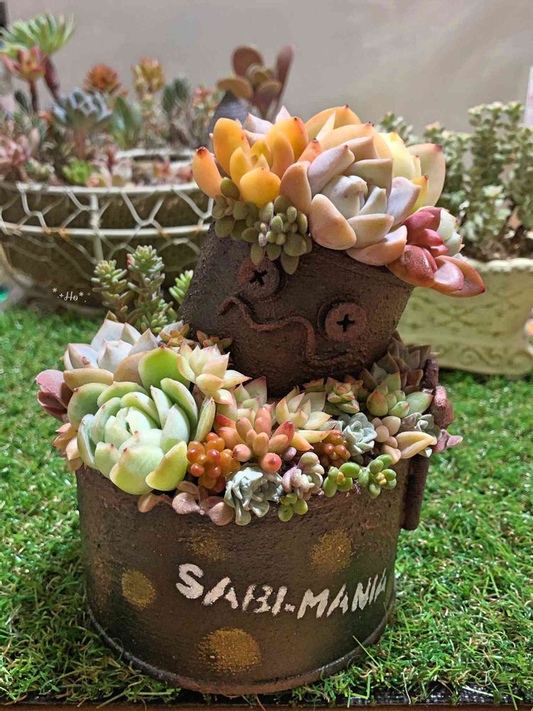 缶のサビ色と多肉ちゃん達の色合いのコンビネーションが最高ですね♬