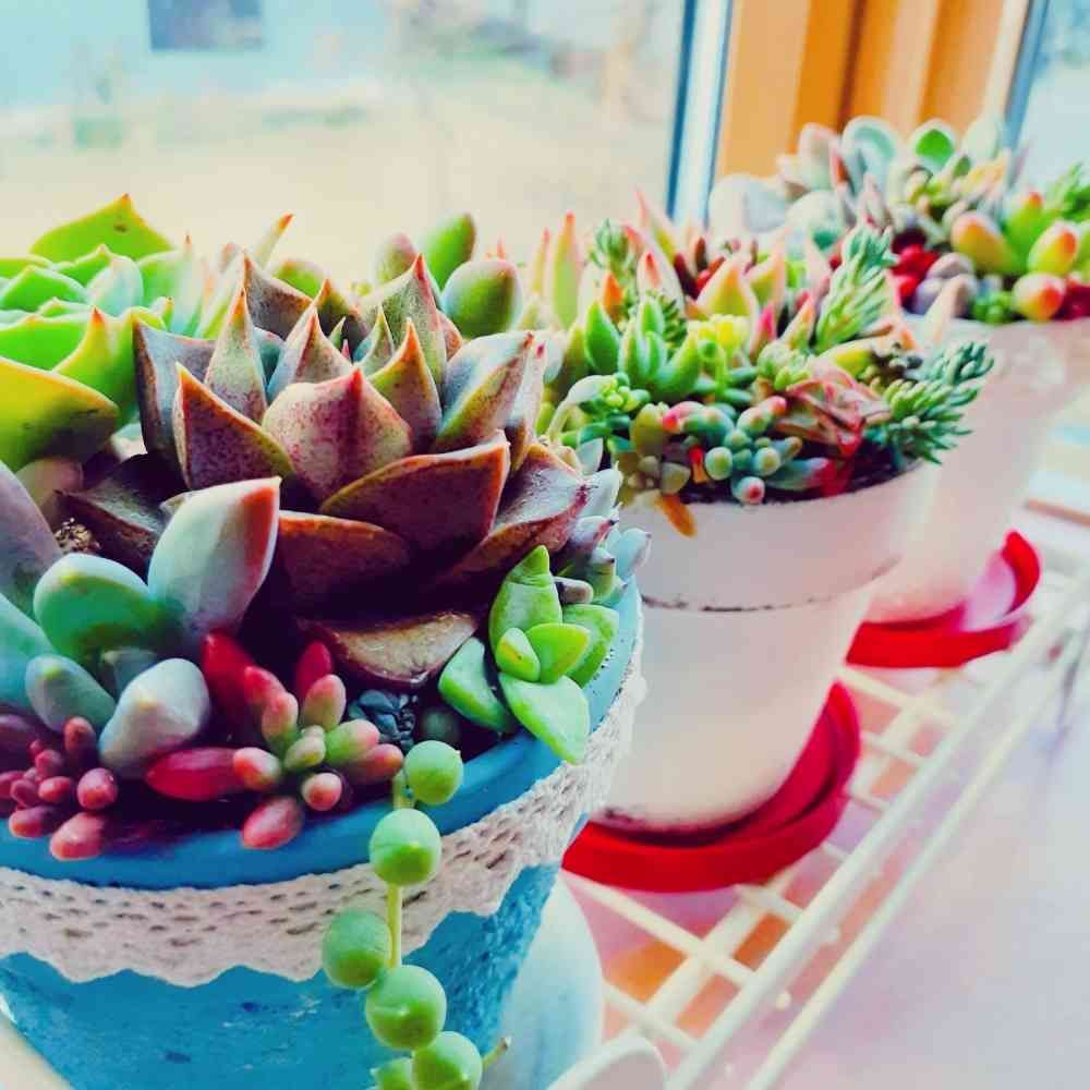 窓辺,紅葉する多肉,多肉寄せ植えの投稿画像