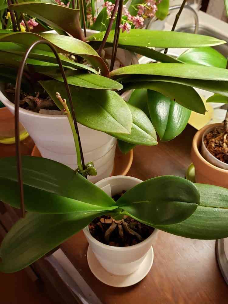 そして、今回の写真はその見切り品株の中で初めて花芽をつけてくれた子。品種名不明。自分で育てた胡蝶蘭が初めて花を咲かせる瞬間が楽しみです😊💕