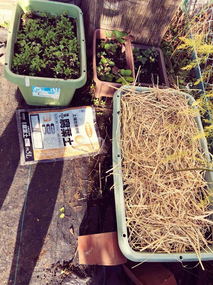 12/24(火)晴れ☀️ おはよーございます( ◠‿◠ )小さい庭の朝の見廻りしています。暖かい日の指す冬の朝です、昨日アスパラガスのプランターからサフィニアの芽🌱と思われる植物を他のプランターに移植したのでアスパラガスの方に腐葉土と敷き藁をしました。此の夏には零れ種で葉鶏頭まで同居していました👀2年目です、どんなアスパラが出ますか楽しみです🎶