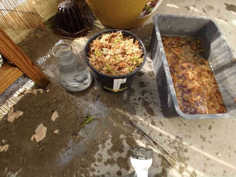 二日前にやろうと思って準備していた乾燥水苔を使い、フラスコ苗からの植え替え完了。