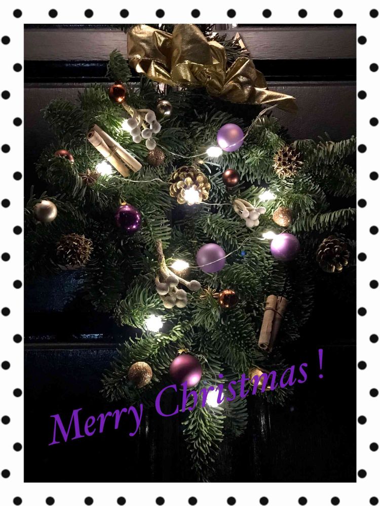 今年はドアスワッグを作った。オーナメントは拾い集めた木の実と戸棚奥に眠っていたもの。ライトは100均〜。
