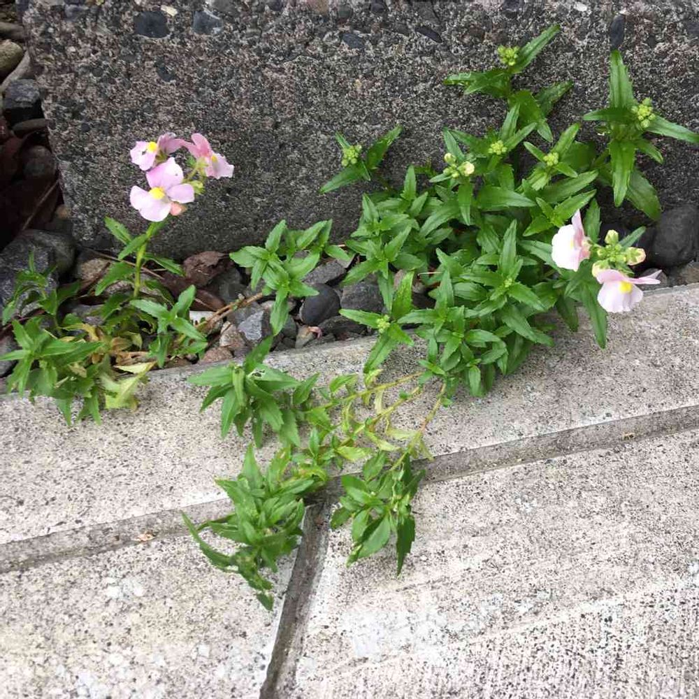 ネメシア、小石の中 こぼれダネから芽を出し お花を咲かせてくれました