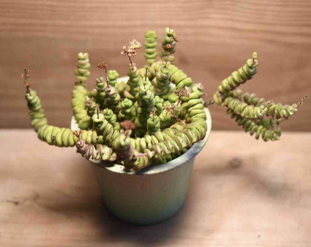 にょろにょろ伸びたので鉢の上に渦巻き状にしている数珠姫。