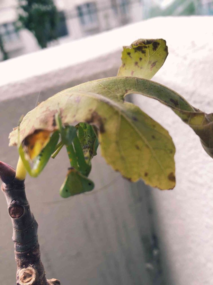 12/25(水)曇り☁️ おはよーございます(๑>◡<๑)今日のカマキリ母さんです、イチヂクの葉も最後の1枚ですがどうしてあげたら良いのか判りません。植物の様にビニール保温で良いでしょうか?