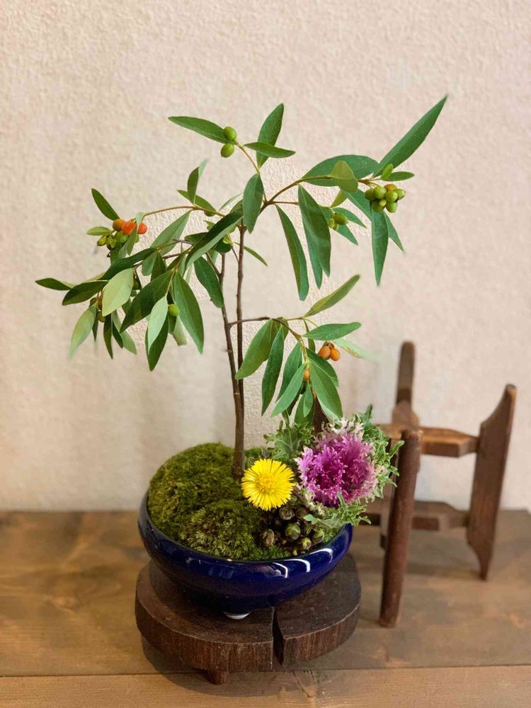 樹木盆栽の添えに季節感のある草物が使われるけど、今回の葉牡丹や吹きタンポポも今の時期にピッタリで、主役のヤンバルガンピを引き立ててくれてるよね❣️