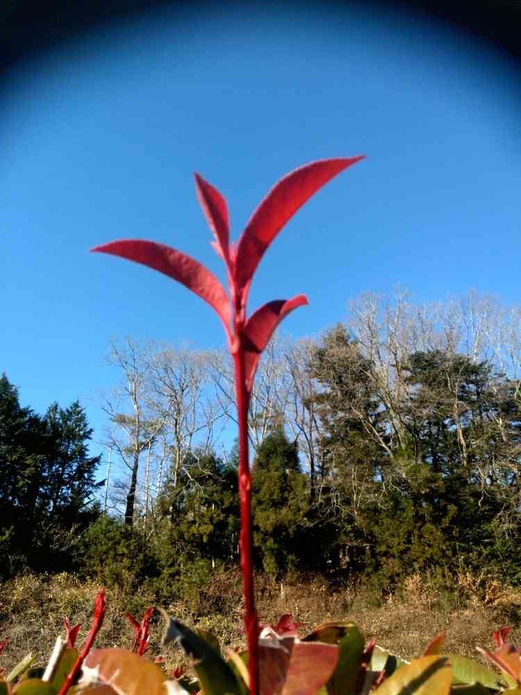 朝の散歩の途中、寒空の中に伸びる紅い芽をパチリ