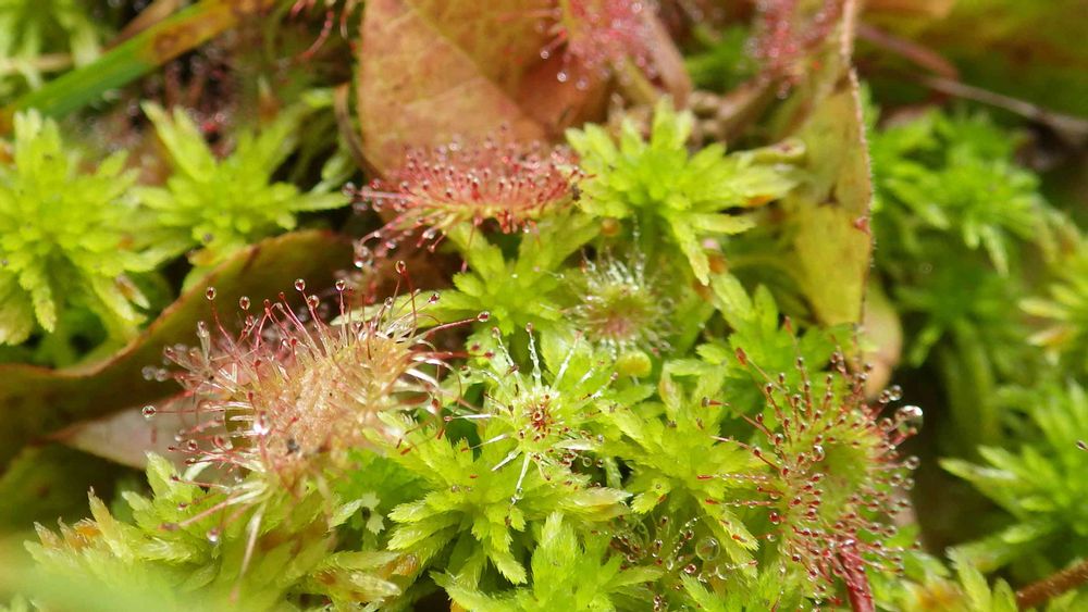 北大雨龍研究林のアカエゾマツ湿地林に自生しているモウセンゴケです。食虫植物はミズゴケや水滴の似合う種が多いですよね。