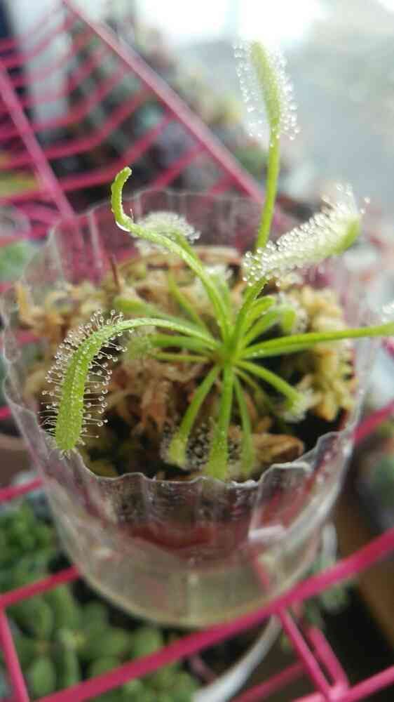 うちのモウセンゴケさん2株になっちゃったけど、500ペットボトルにすっぽり入ってたのが最近は狭そうです…。
