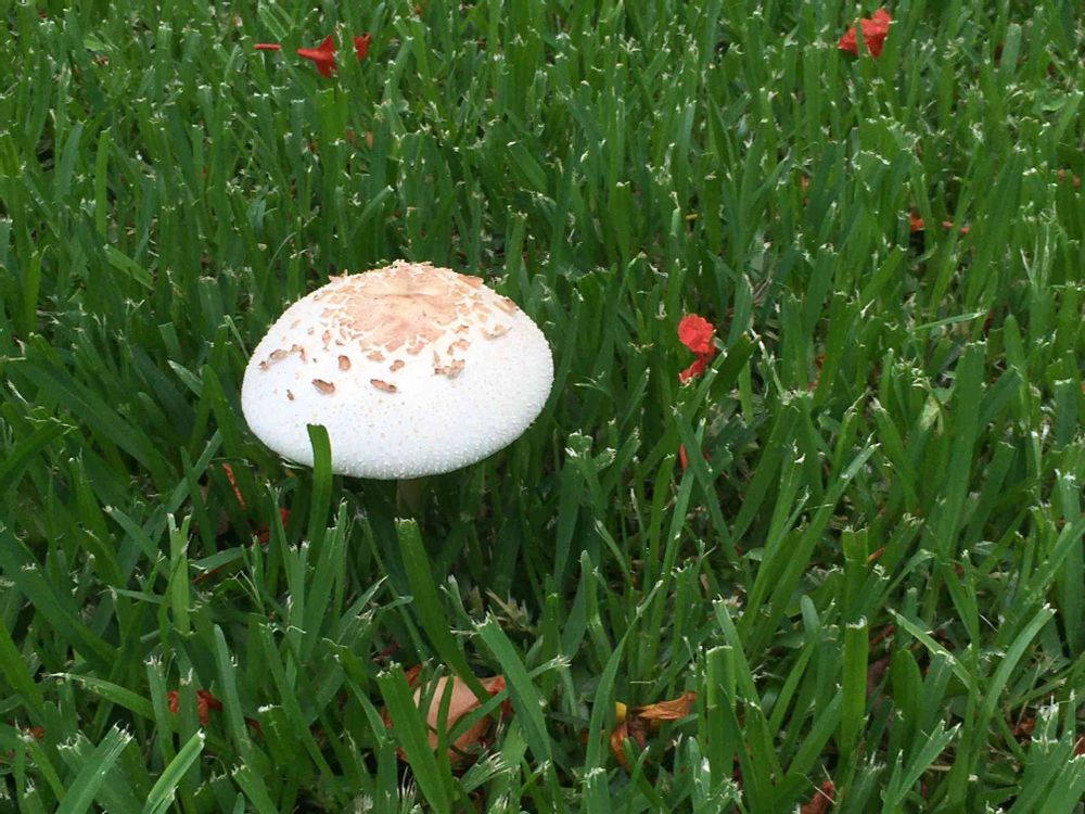 で、乾いた庭が緑になり、いきなり巨大キノコが🍄(笑)