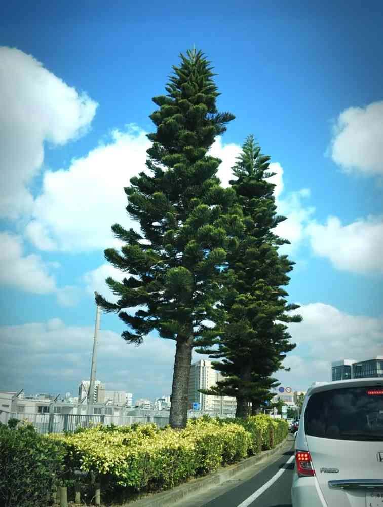 ✴️那覇空港から車で58号線へ5分のところ。その間の街路樹は、モモタマナ。そして、このナンヨウスギなどが続き、後はマニラヤシやトックリヤシモドキ、八重山ヤシなど🌴が連なっていきます。