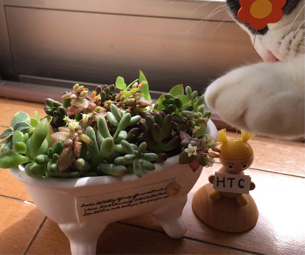 このあと、人形の頭に手を置き、倒しましたが、すぐ、寄せ植えとお人形救出して、グリちゃんは、ムッとして、どっかいきました💦💦