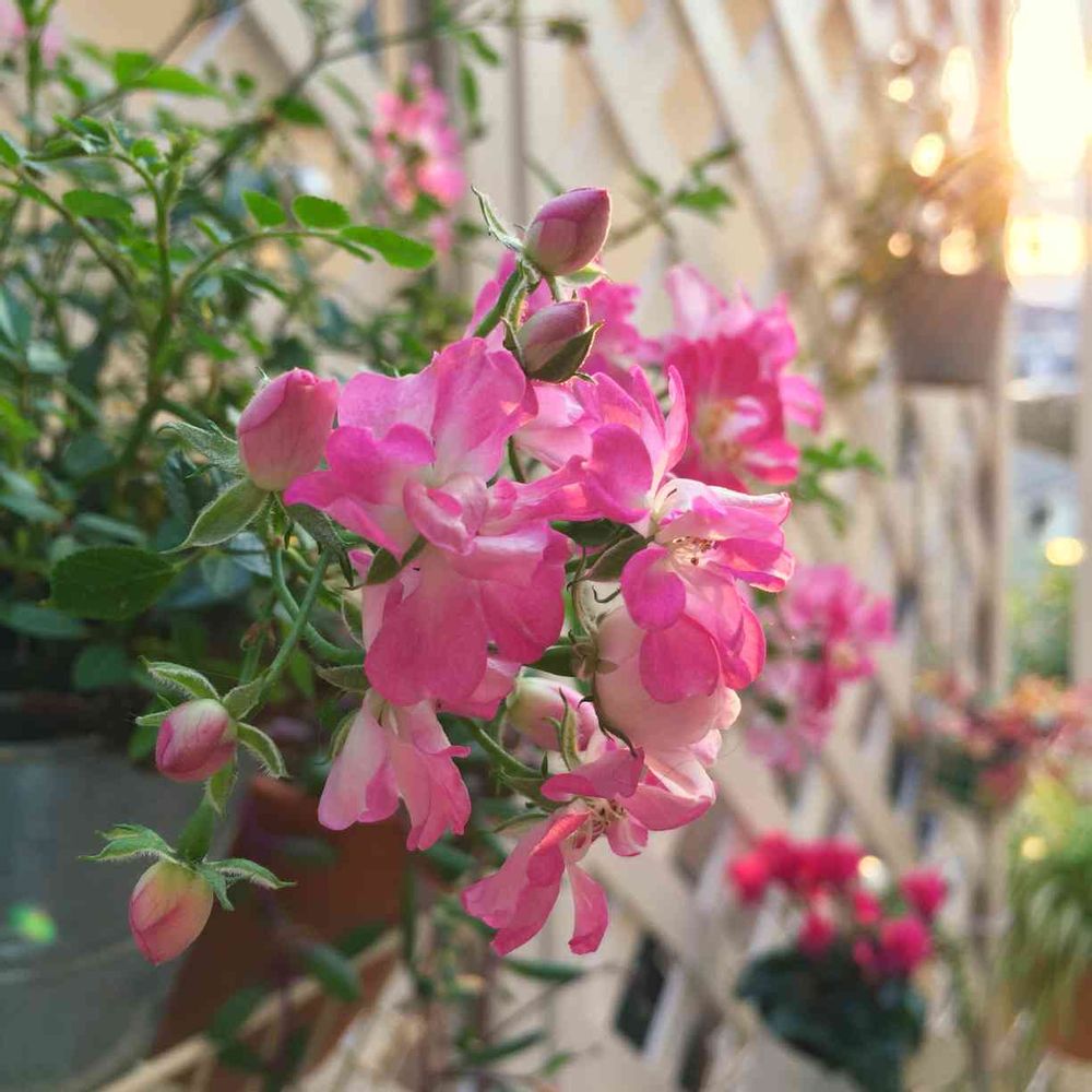 レンゲローズがまた可愛い花を咲かせています。夕日に照らされて綺麗だなぁ✨