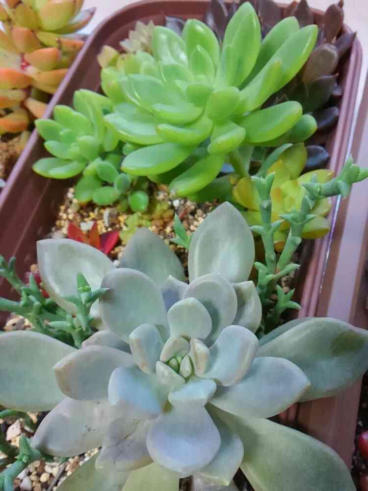 手前のエケベリア?(名前が分からない)は徒長ですね😅寒さに当てて、やっと締まってきました。春には胴切りです。