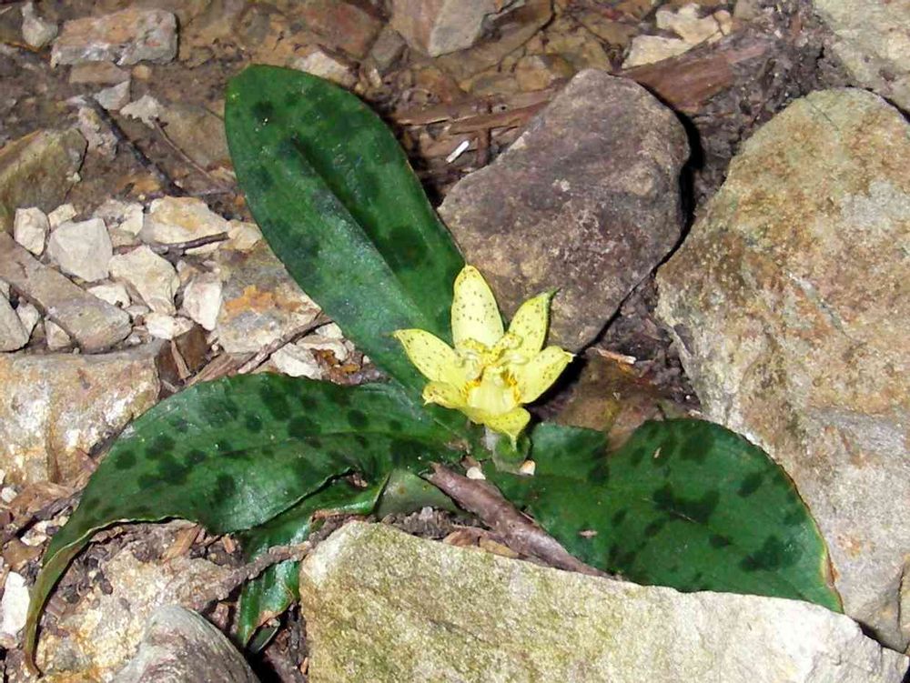 少し薄暗い登山道に地面スレスレに咲いていました。